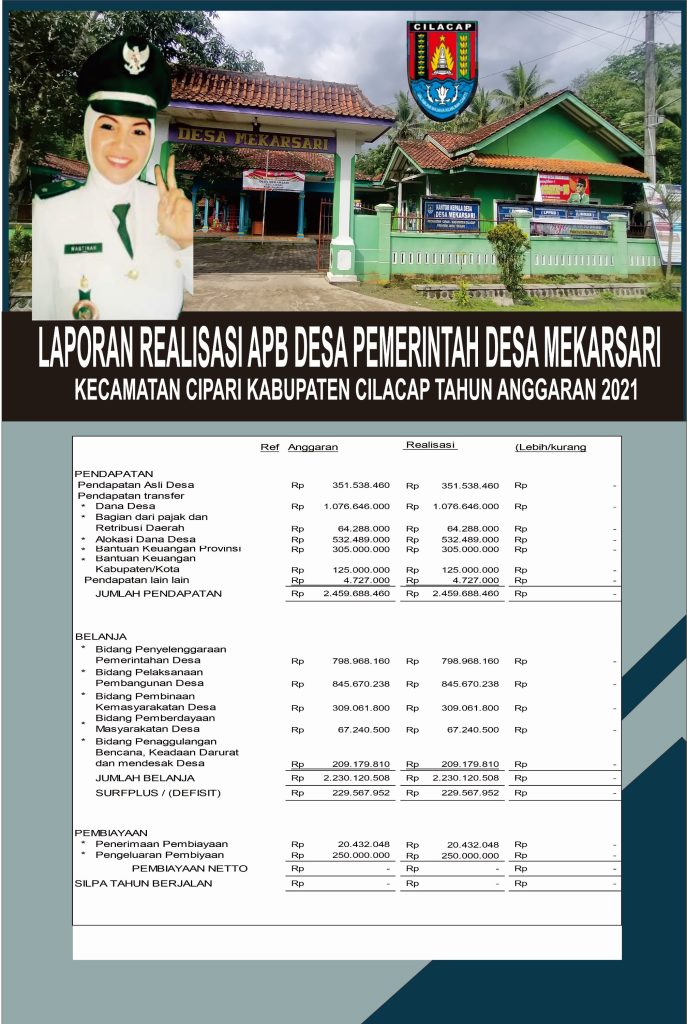 LAPORAN REALISASI APBDesa PEMERINTAH DESA MEKARSARI KECAMATAN CIPARI KABUPATEN CILACAP TAHUN ANGGARAN 202129 April 2022, 11:21 | Kabar DesaBerikut kami lampirkan Laporan Realisasi APBDesa Desa Mekarsari Kecamatan Cipari Kabupaten Cilacap Tahun Anggaran 2021.Bagikan BeritaKirim Komentar Batalkan balasanAlamat email Anda tidak akan dipublikasikan. Ruas yang wajib ditandai *Komentar *Nama * Email * Situs Web Simpan nama, email, dan situs web saya pada peramban ini untuk komentar saya berikutnya. Δ