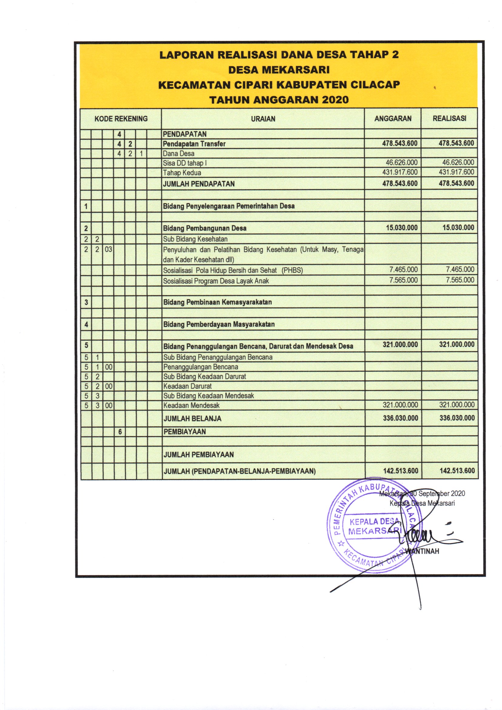 LAPORAN REALISASI DANA DESA TAHAP 2 TAHUN ANGGARAN 2020 DESA MEKARSARI23 Desember 2020, 10:03 | Kabar DesaBerikut kami lampirkan Laporan Realisasi DD Tahap 2 Tahun Anggaran 2020 Desa Mekarsari Kecamatan Cipari Kabupaten Cilacap.Bagikan BeritaKirim Komentar Batalkan balasanAlamat email Anda tidak akan dipublikasikan. Ruas yang wajib ditandai *Komentar *Nama * Email * Situs Web Simpan nama, email, dan situs web saya pada peramban ini untuk komentar saya berikutnya. Δ